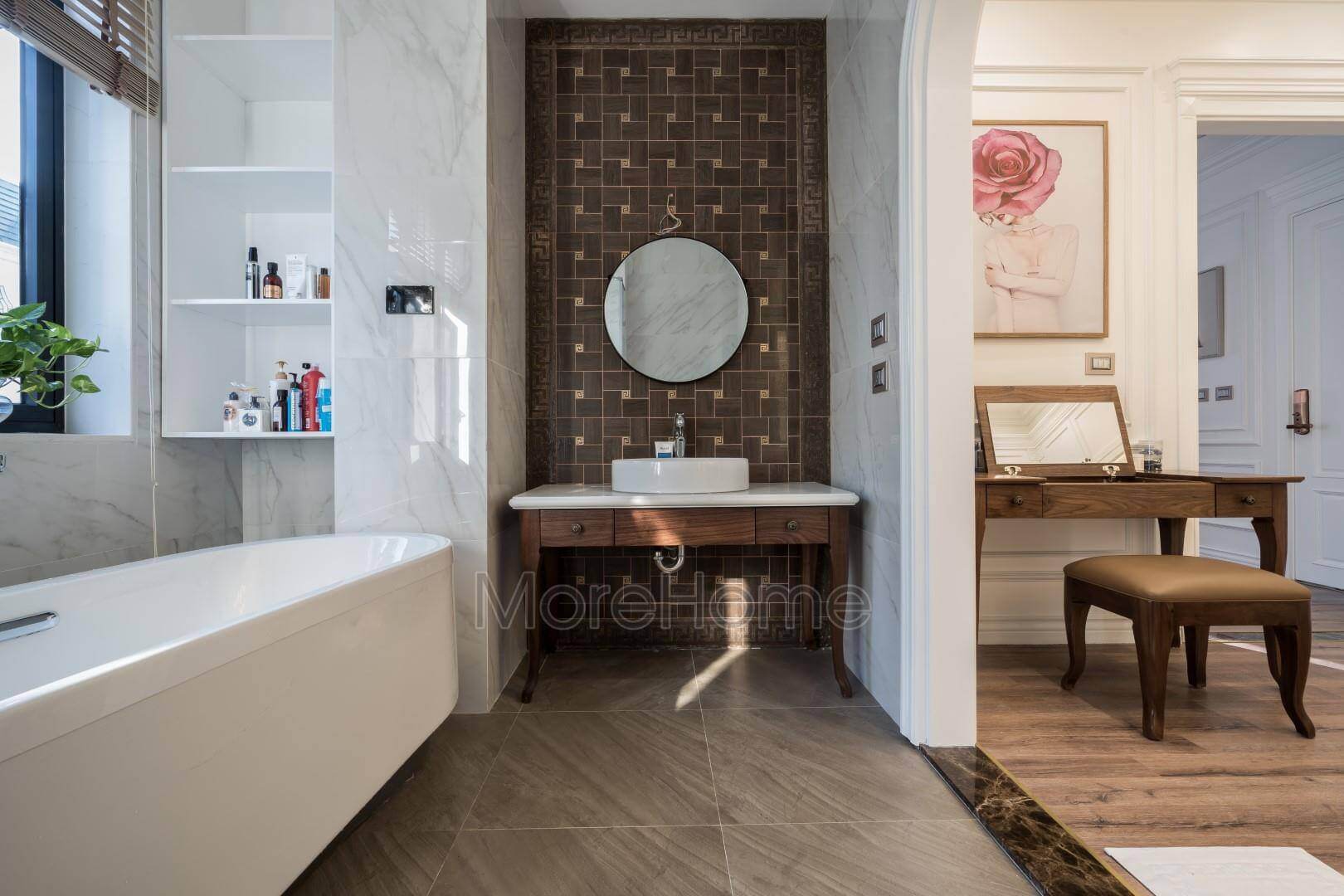 Sư dụng đá ốp tường phòng tắm màu trắng với đường vân loang sang trọng tạo điểm nhấn nổi bật cho không gian phòng tắm biệt thự