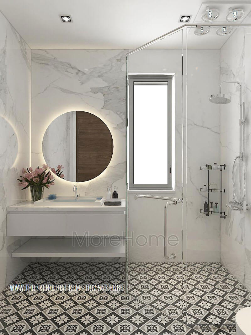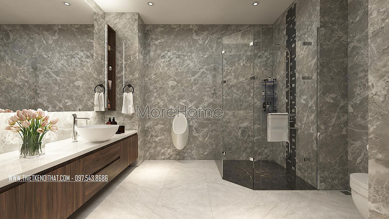Phòng tắm được thiết kế với mảng tường và sàn nhà được ốp đá nhân tạo vân mây cao cấp tạo sự sáng bóng