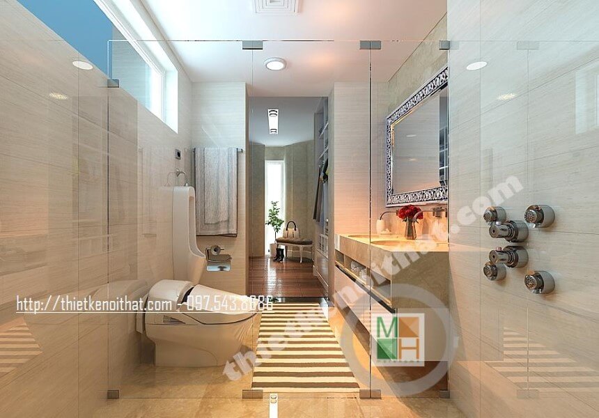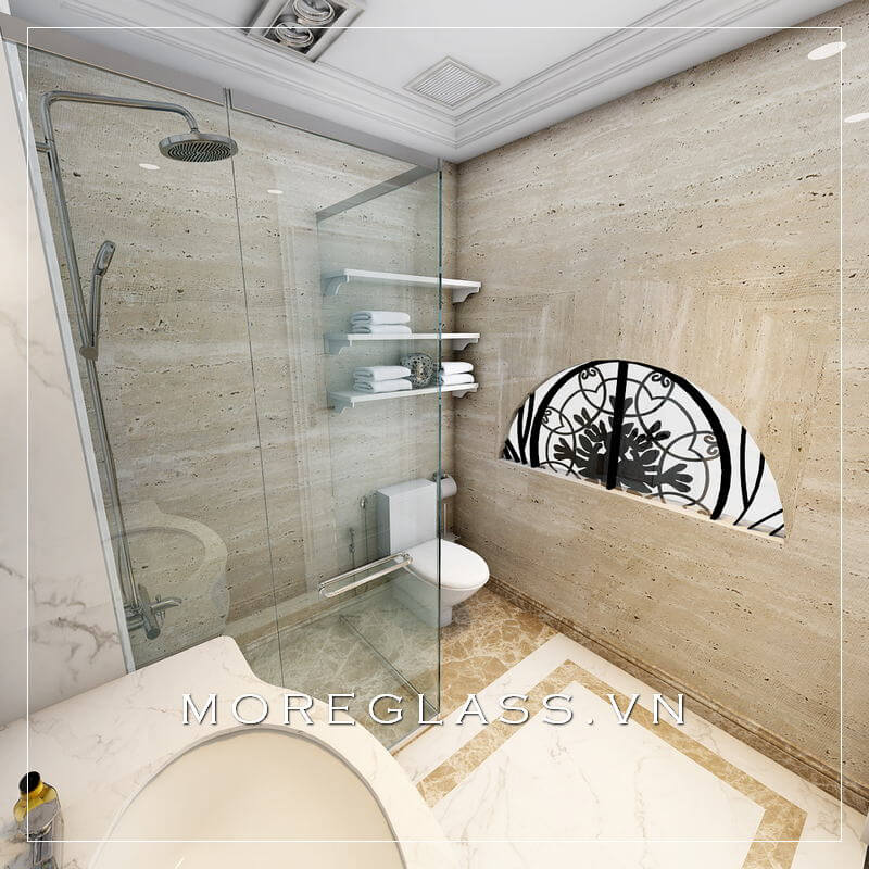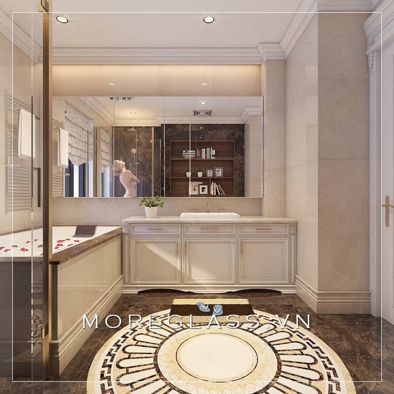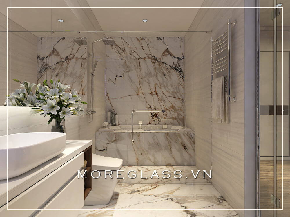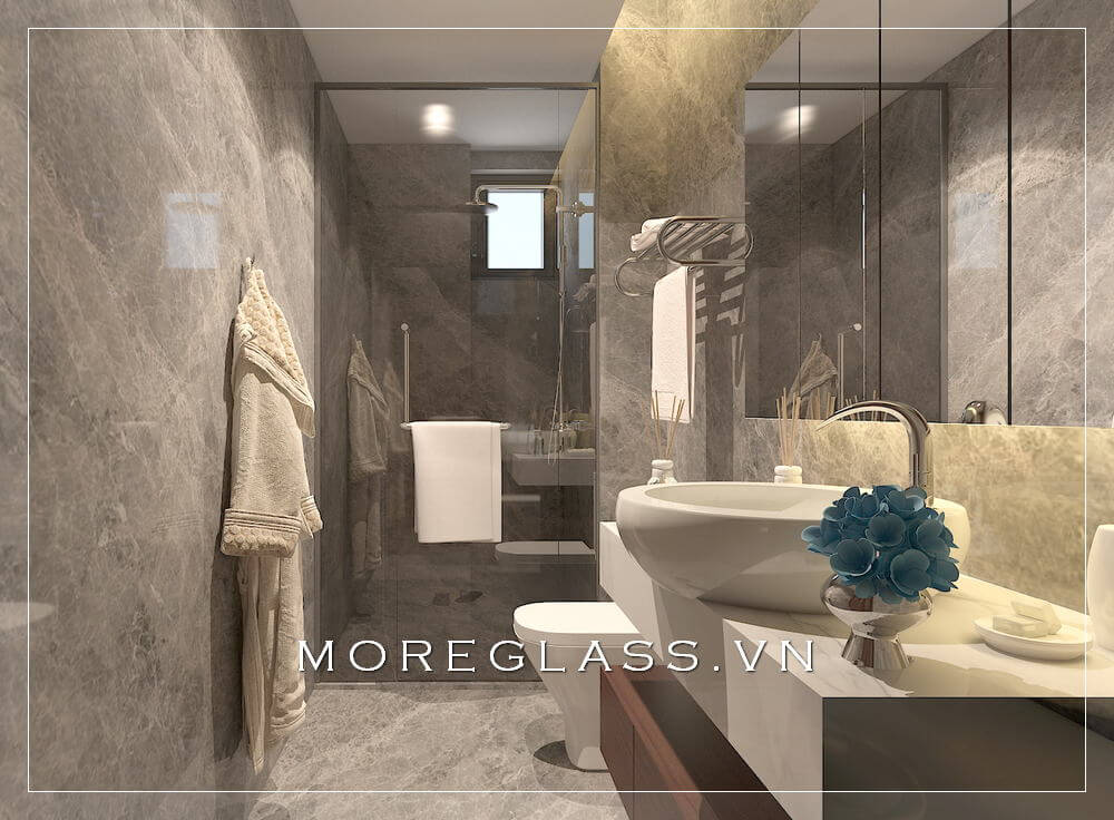 Thiết kế nội thất phòng tắm hiện đại với vật liệu kính, đá ch không gian phòng rộng và thoáng hơn