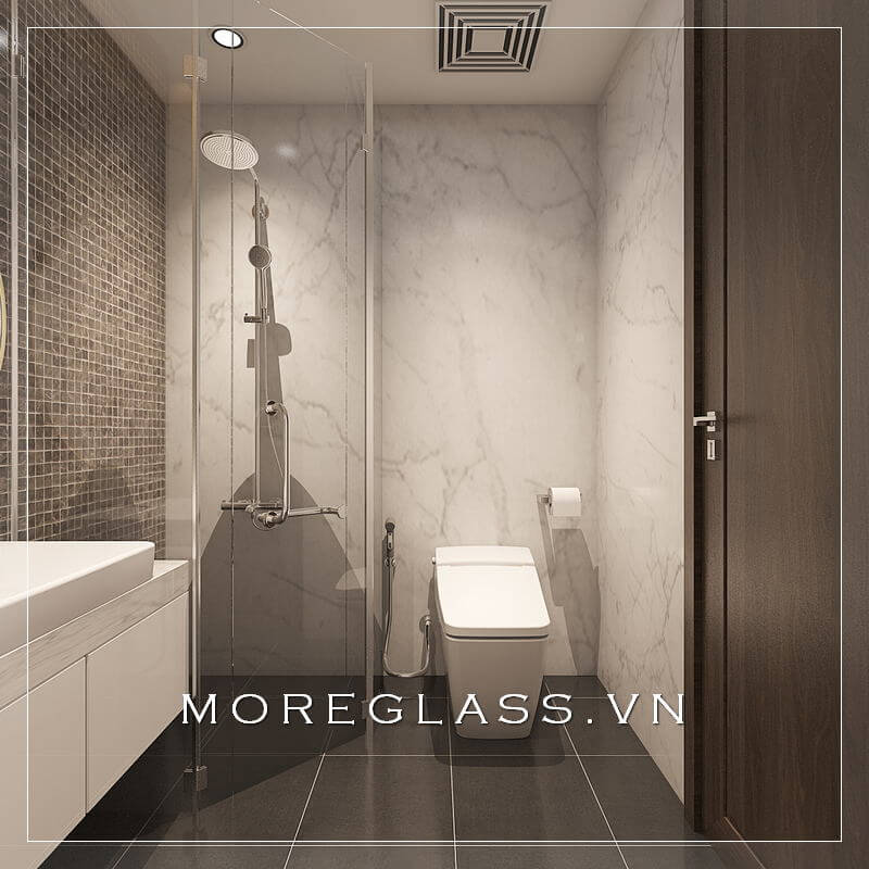 Thiết kế phòng tắm hiện đại với kính cường lực và đá ốp tường màu trắng vân mây tạo sự thoáng mát và sạch sẽ