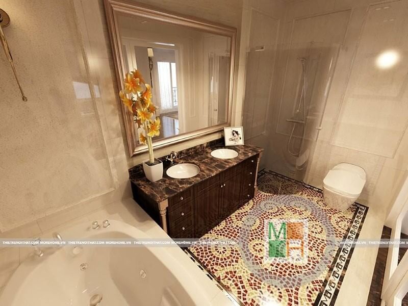Sự dụng gạch lát nền hoa văn độc đáo, kết hợp đá ốp tường phòng tắm màu vàng sáng, bức gương kính lớn tạo nên không gian phòng tắm rộng rãi, sang trọng