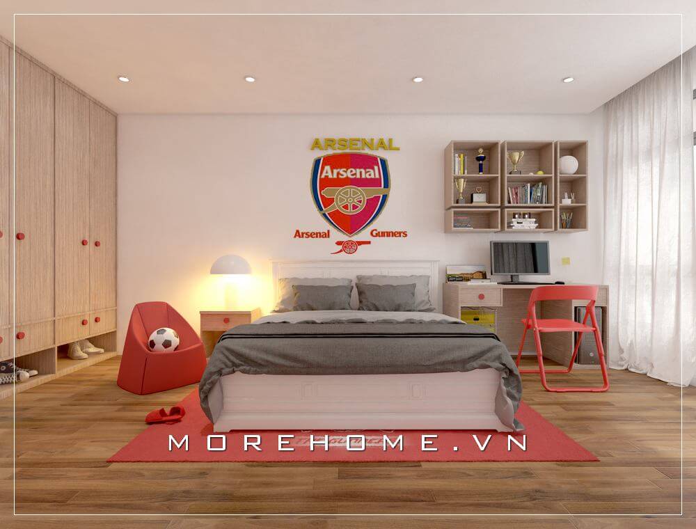 Giường ngủ gỗ hộp kiểu dáng thấp, gam màu trắng trẻ trung được bố trí chính giữa tạo sự sang trọng, thông thoáng hơn, giúp con có một không gian nghỉ ngơi và học tập thoải mái nhất