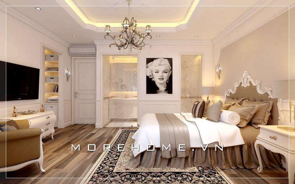 Nội thất phòng ngủ biệt thự tân cổ điển đầy sang trọng và đẳng cấp, bố cục sắp xếp hài hòa, không quá nhiều điểm nhấn trong phòng tạo sự thông thoáng cho cả căn phòng