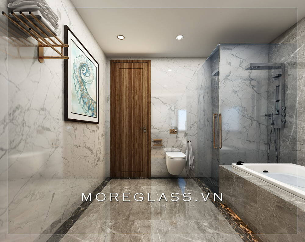 Mang đến không gian hoàn hảo trong từng chi tiết với mẫu thiết kế phòng tắm sang trọng sử dụng đá tự nhiên màu trắng vân mây ốp nền và tường kết hợp vách kính tắm cường lực phân cách hai không gian nhà vệ sinh với phòng tắm.