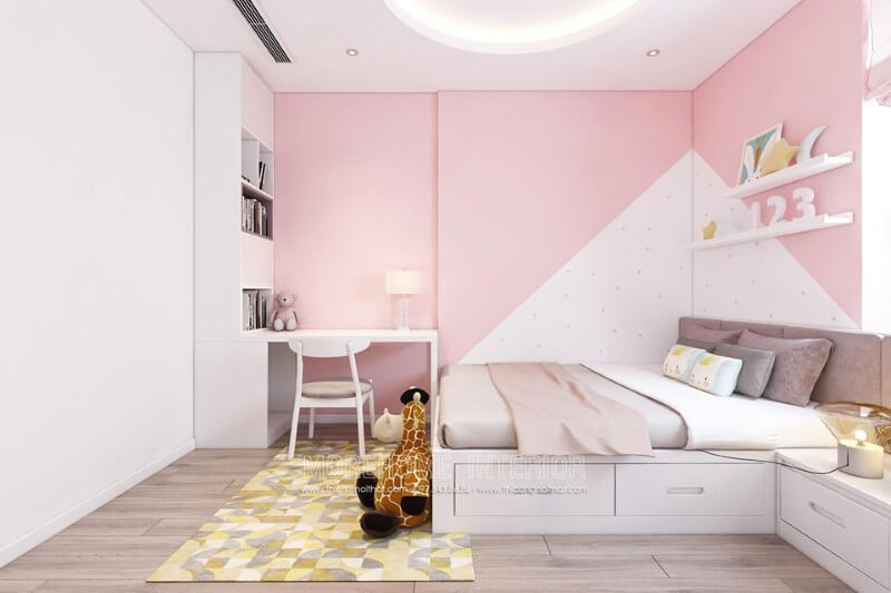 Phòng ngủ con được thiết kế nhẹ nhàng ấm áp với gam màu hồng cam
