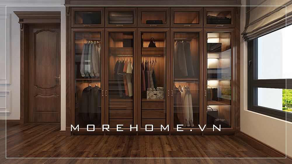 Tủ quần áo óc chó kết hợp cánh kính sang trọng được xem là sự lựa chọn hoàn hảo cho cả căn phòng