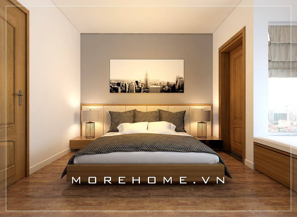 Giường ngủ chung cư hiện đại, đơn giản, gam màu vàng gỗ công nghiệp đầy tinh tế tạo cảm giác thoải mái và ấm áp hơn cho mỗi giấc ngủ của gia chủ