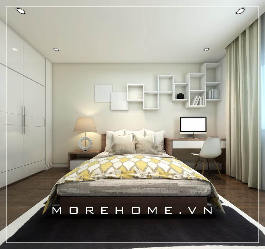 Giường ngủ chung cư với thiết kế hiện đại, đơn giản, tone màu nâu trầm ấm tạo cảm giác thoải mái và thư giãn hơn cho không gian phòng ngủ nhỏ