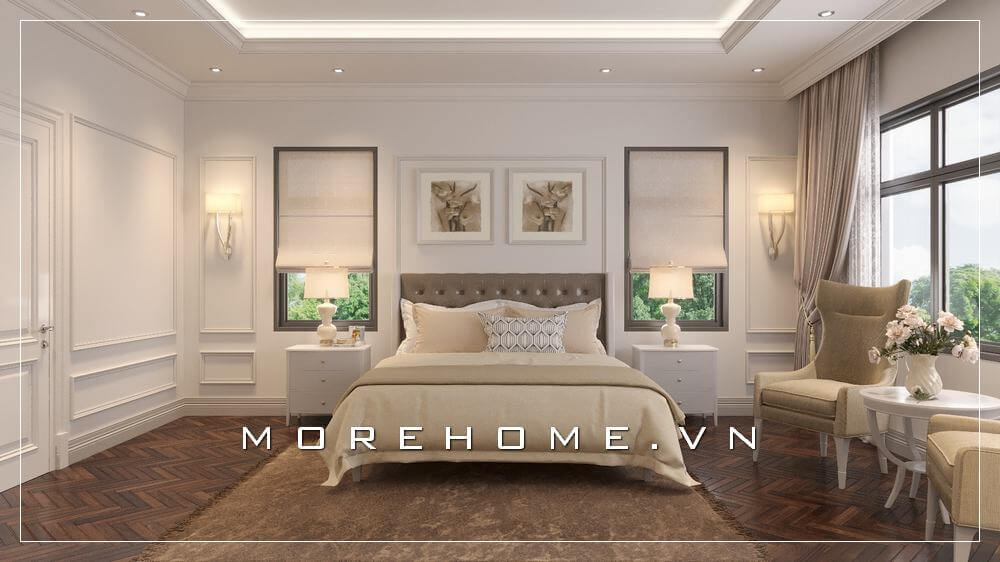 Giường ngủ biệt thự cao cấp được thiết kế theo phong cách tân cổ điển nhẹ nhàng mà đơn giản, phần đầu giường cách điệu lạ mắt được gia chủ lựa chọn trong mẫu thiết kế phòng ngủ này