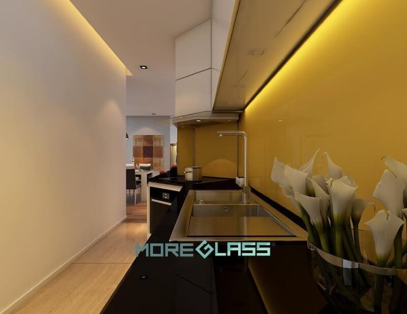 Bố trí mẫu kính ốp bếp màu vàng thư tươi tắn cho không gian nhà bếp thêm mới lạ đầy sức sống.