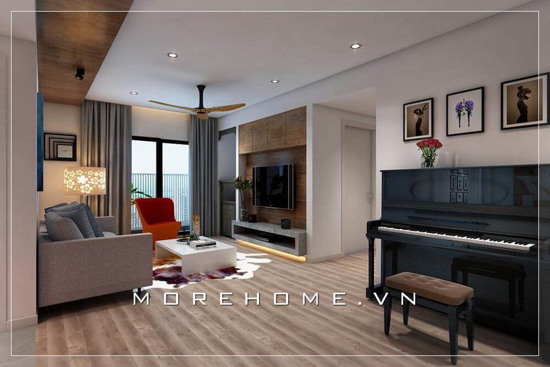 Thiết kế nội thất phòng khách có đàn piano ấn tượng với cách trang trí mộc mạc từ chất liệu gỗ nhưng phá cách với bức tranh treo tường sống động trong không gian căn hộ chung cư.
