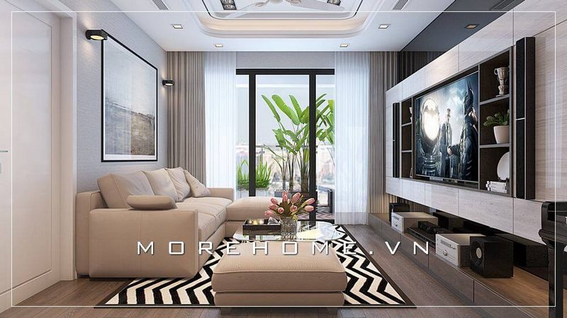 Mẫu thiết kế nội thất phòng khách của chung cư hiện đại được trang bị đầy đủ các tiện nghi, tạo nên một không gian thân thiện, thoải mái dành cho gia chủ.