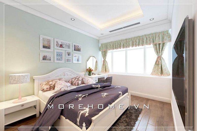 Nội thất trắng tinh tế và sàn gỗ nâu trầm ấn tượng được lựa chọn để trang trí phòng ngủ của chung cư, khiến cho căn phòng trở nên sang trọng và hiện đại hơn.