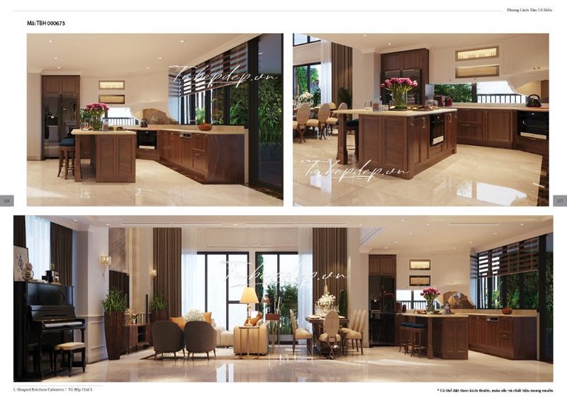Thiết kế phòng bếp trong không gian mở với sự sử dụng của gỗ óc chó theo phong cách tân cổ điển màu nâu đẳng cấp sẽ làm nổi bật vẻ đẹp của biệt thự, nhà phố, chung cư cao cấp.